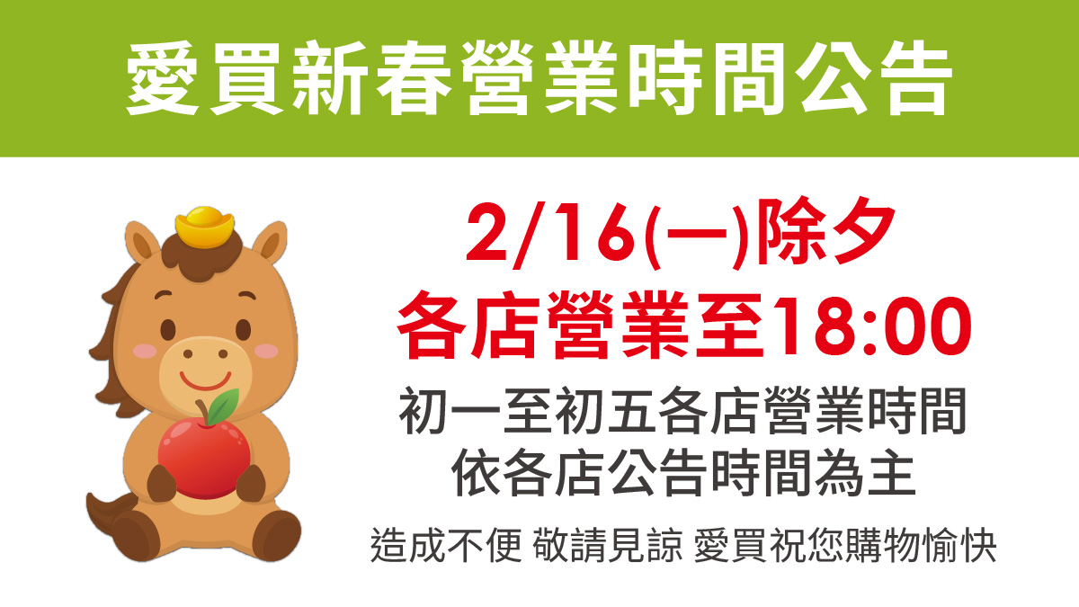 根據愛買新春營業公告,2/16(一)除夕各店將營業到晚上 6 點,初一至初五十計營業時間依各店公告為準。