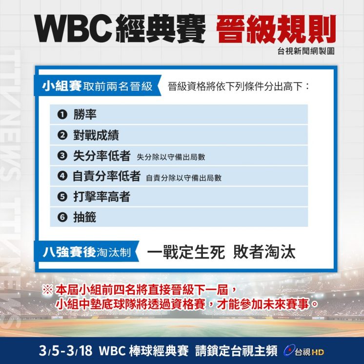 今年世界棒球經典賽預賽採分組進行,分為 A、B、C、D 四組。小組賽中成績最好的前 2 支球隊得晉級八強,至美國參加複賽。接著由不同組別的戰績第二與第一對決,4 支優勝隊伍可進入四強賽,最終獲勝 2 隊可進入冠軍賽。