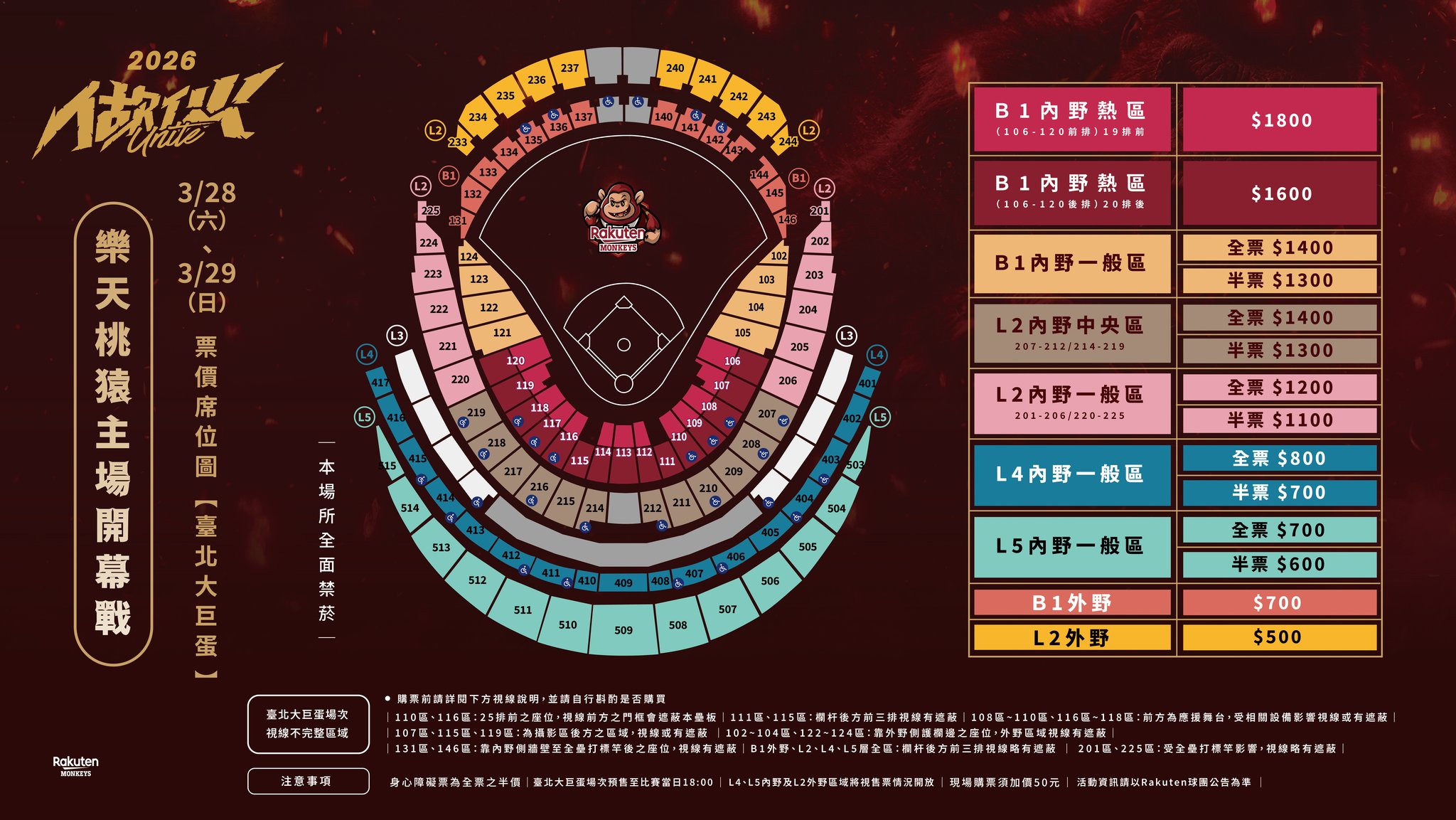 開幕戰為樂天桃猿主場,將在 3/28(六)、3/29(日)分別迎戰中信兄弟和味全龍,門票依票種、區域有不同的價格,全票外野區 500、700 元,內野區 700 至 1800 元,詳見下表。