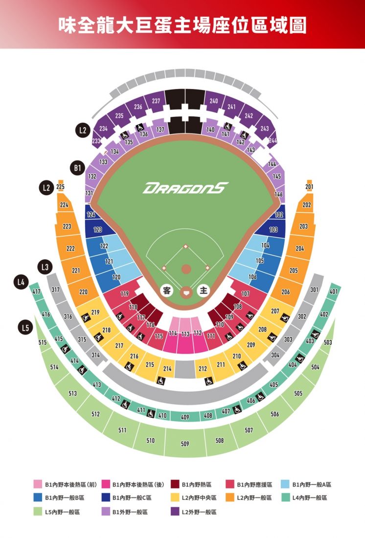 味全龍已公布今年大巨蛋主場座位圖,各區座位如下。