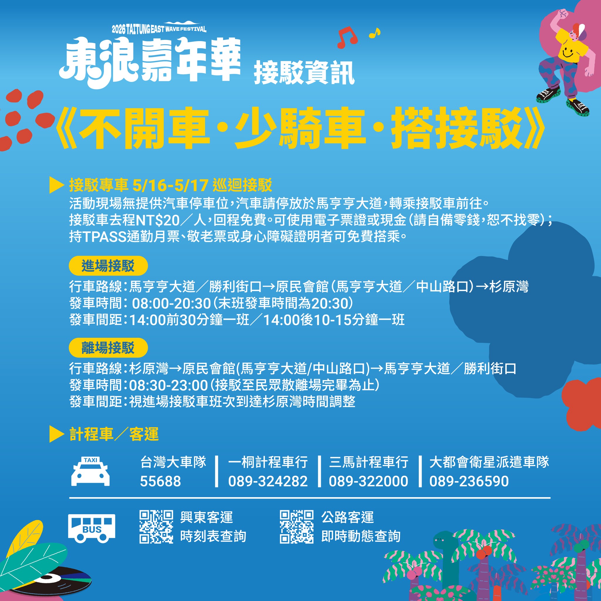 由於現場無停車場位,開車的朋友可將車輛停放在馬亨亨大道,再轉搭接駁車抵達東浪嘉年華會場。去程 20 元,回程免費,可使用現金或電子票證搭乘。