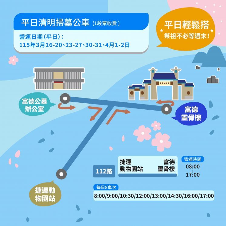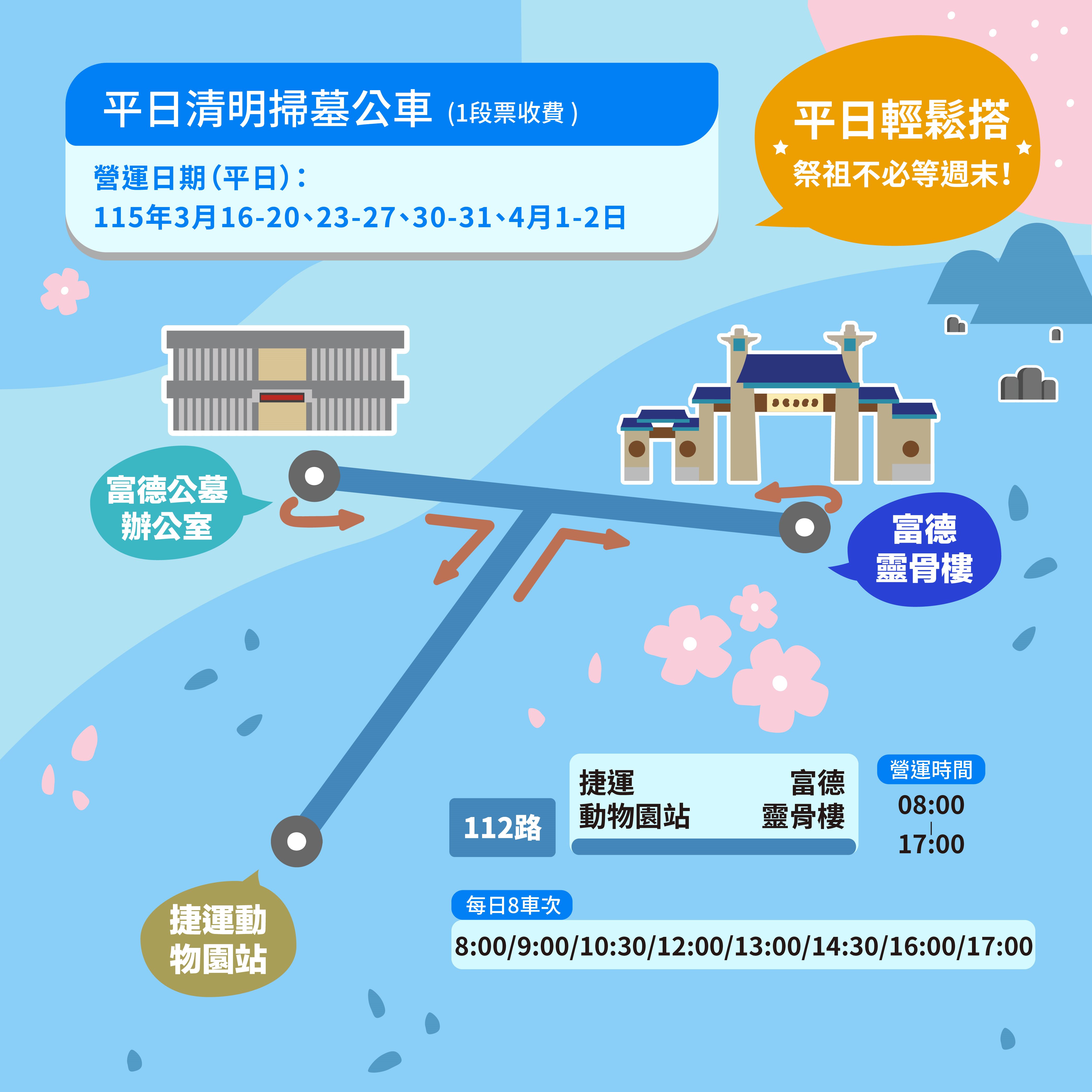 若只能在平日祭祖的朋友,可於 3/16~3/20、3/23~3/27、3/30~3/31、4/1~4/2 捷運動物園站搭乘 112 號掃墓公車,每日有 8 個班次。