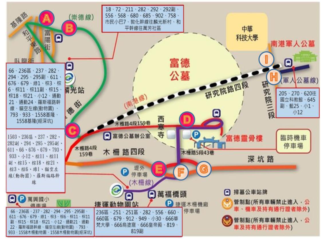 | 接駁路線 | 南港軍人公墓 - 富德公墓辦公室 - 富德靈骨樓 |