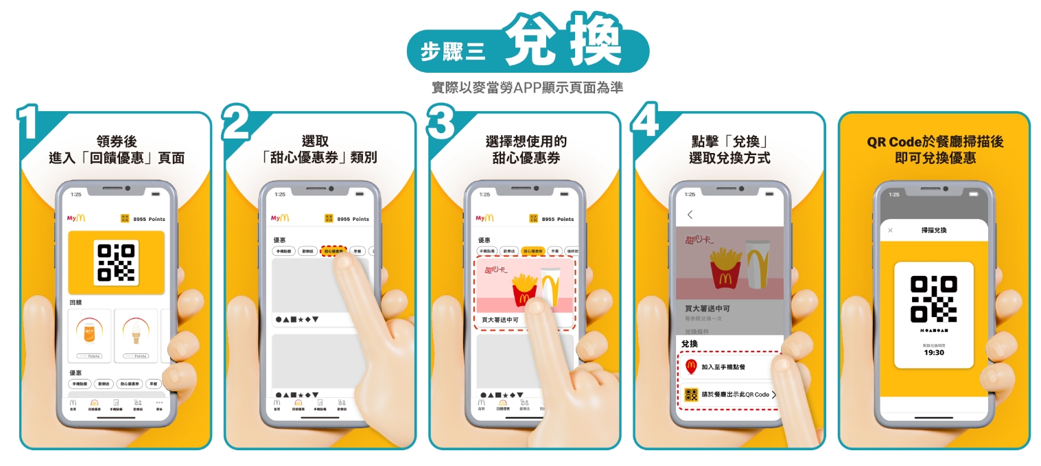 - 使用地點:麥當勞餐廳櫃台、自助點餐機、得來速窗口,不適用歡樂送、第三方外送平台、桃園機場第二航廈管制區及部分門市。