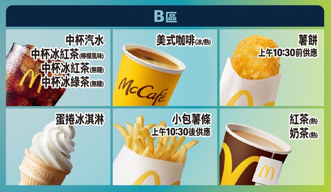 不知道怎麼點的話,可以參考麥當勞提供的以下甜心卡購買組合(B區贈送咖啡或奶茶最划算):