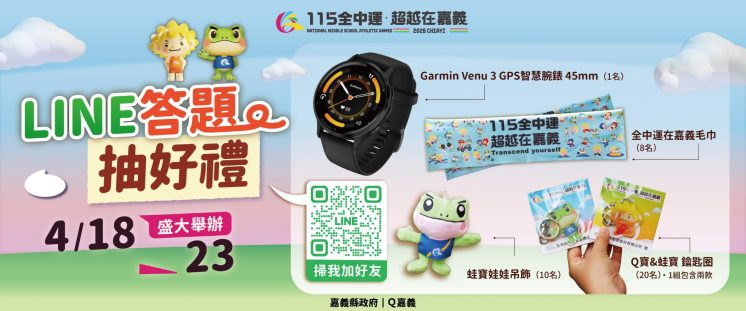 3/18~4/16 加入嘉義縣政府官方LINE,完成測驗就可以抽智慧腕錶、娃娃吊飾、 全中運在嘉義毛巾 !