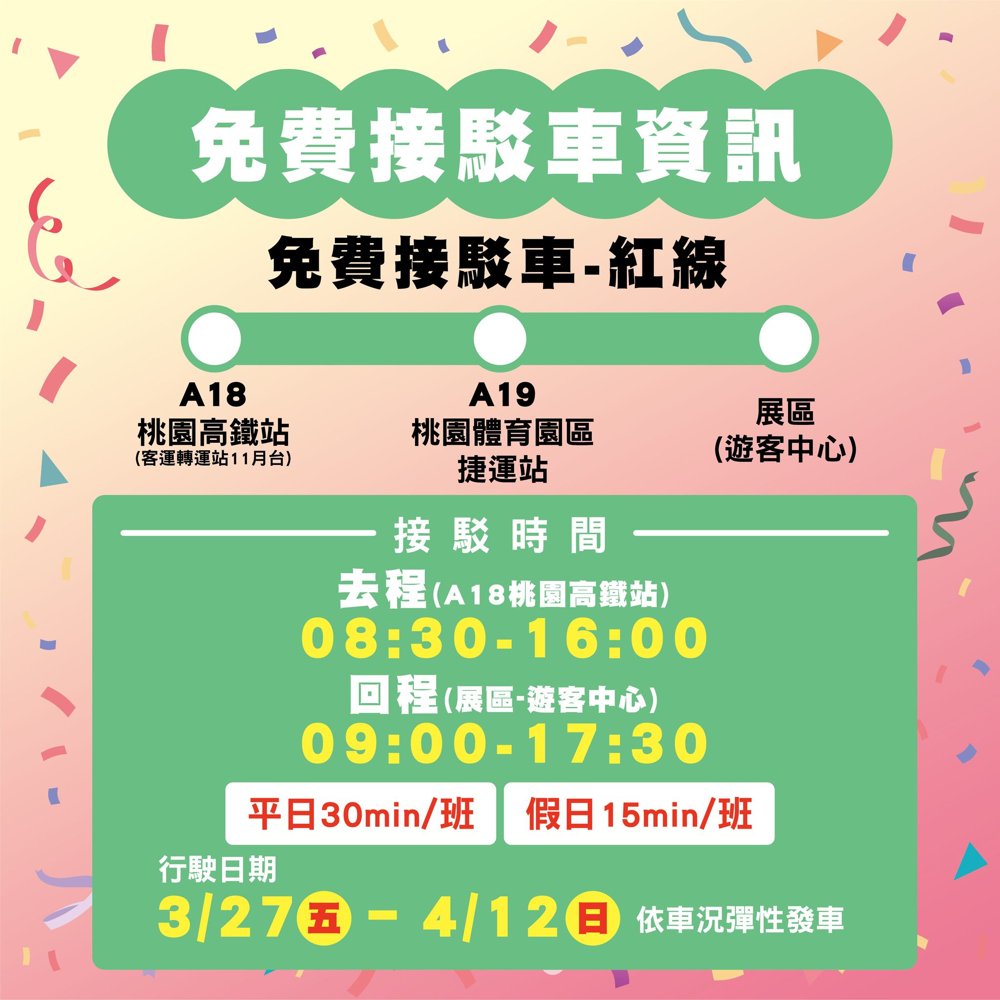 | 接駁時間 乘車地點 | 【去程】A18桃園高鐵站 08:30-16:00 【回程】展區(遊客中心) 09:00-17:00 (依車況彈性發車) |