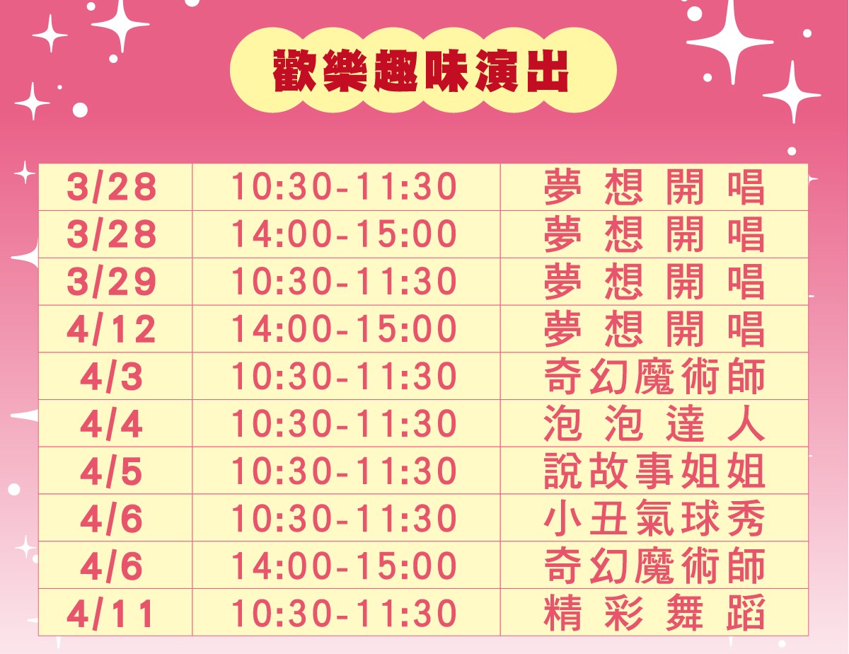 | 手作體驗活動-摺疊拍拍扇 現場拍照打卡加碼送貼紙 | 3/28~29、4/3~6、4/11~12(假日) 14:00-14:30 15:00-15:30 |