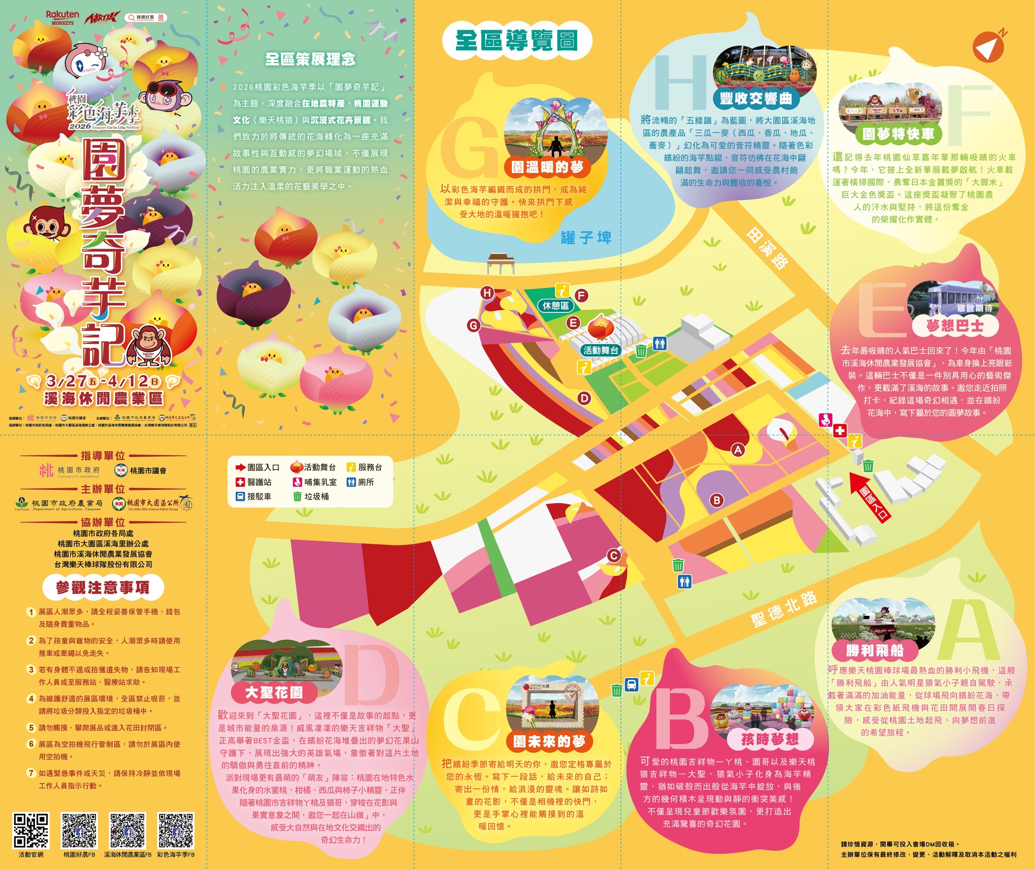 今年桃園彩色海芋季以「園夢奇芋記」為主題,結合春日花卉、在地農特產與桃園運動意象打造 8 大展區。不只萬株花海,更融入去年樂天桃猿奪得中華職棒總冠軍的意象,設置了多個扣緊「夢想」、「勝利」的大型花卉裝置藝術,要迎接這場花季。