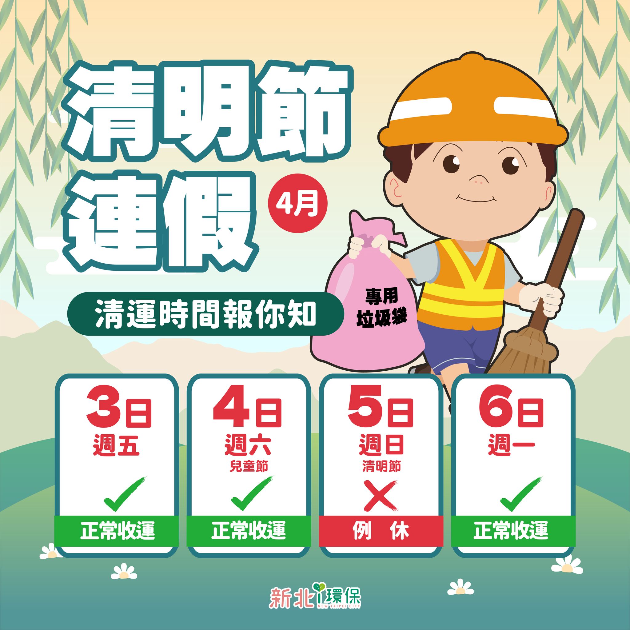 - 新北清明節連假垃圾車清運時間:2026/4/3(五)、4/4(六)、4/6(一)。