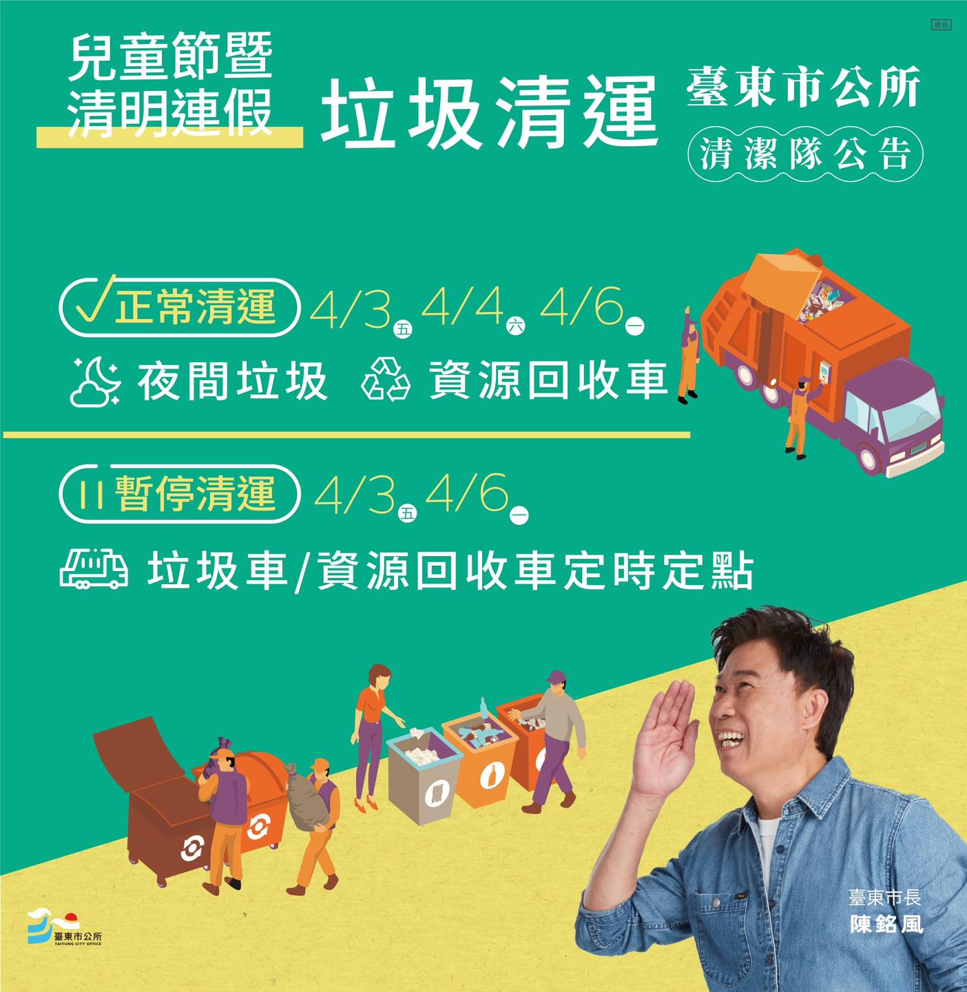 台東縣各鄉鎮市清明節連假垃圾車收運時間不同。台東市 4/3(五)、4/4(六)、4/6(一)晚上垃圾車、資源回收車正常清運,4/3(五)、4/6(一)垃圾車定時定點及資源回收暫停清運。