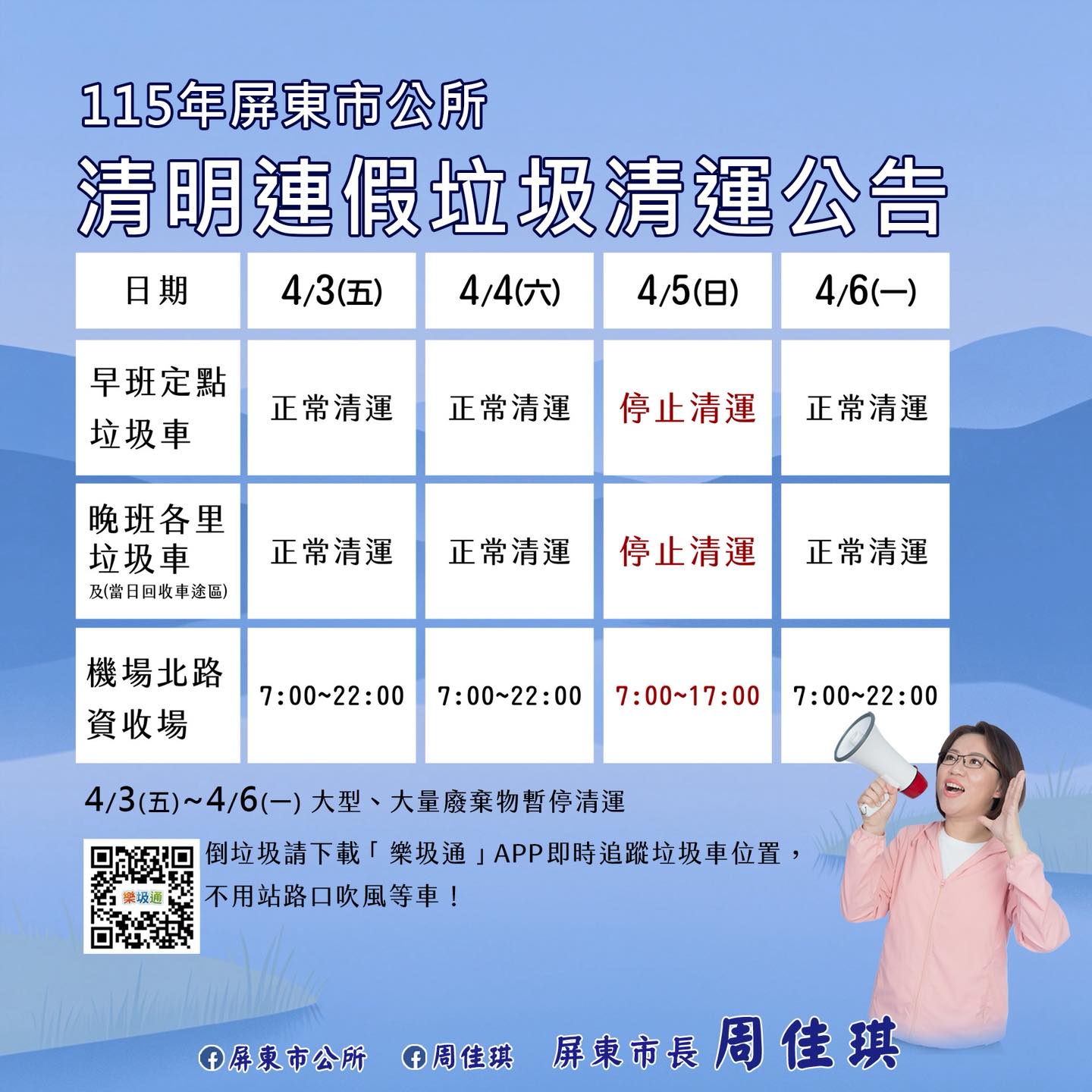 屏東縣各鄉鎮市清明節連假垃圾清運時間不同。根據屏東市公所公告,4/3(五)、4/4(六)早班定點垃圾車、晚班各里垃圾車正常清運,4/5(日)清明節停止收運,可於 07:00-17:00 至機場北路資收場倒垃圾;4/6(一)正常清運。