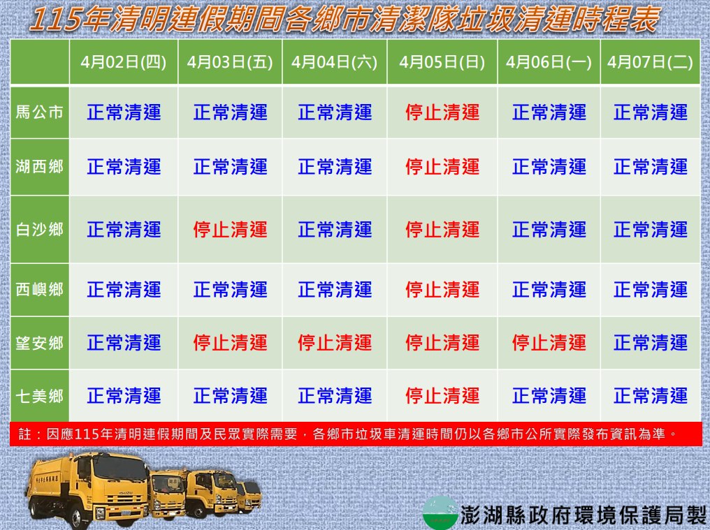 澎湖縣清明連假垃圾清運時程表如下。4/3(五)、4/4(六)各鄉鎮市基本上正常清運,4/5(日)清明節停止清運,4/6(一)除望安鄉之外各地皆正常清運。