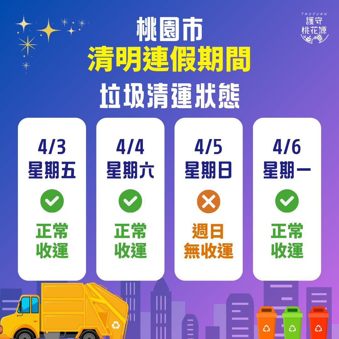 - 桃園清明節連假垃圾車清運時間:2026/4/3(五)、4/4(六) 、4/6(一)。