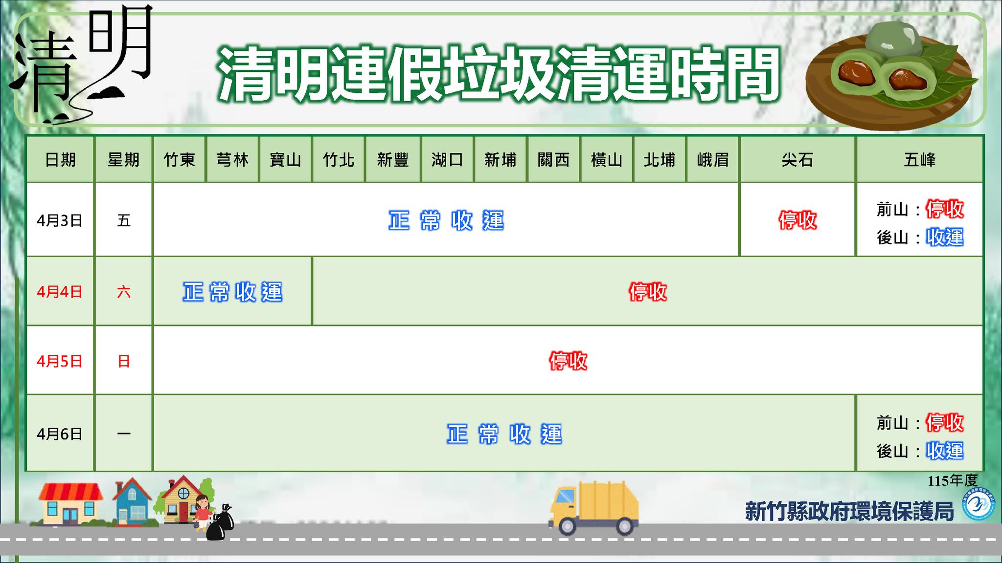 - 新竹市清明連假垃圾清運時間:2026/4/3(五)、4/4(六) 、4/6(一)。