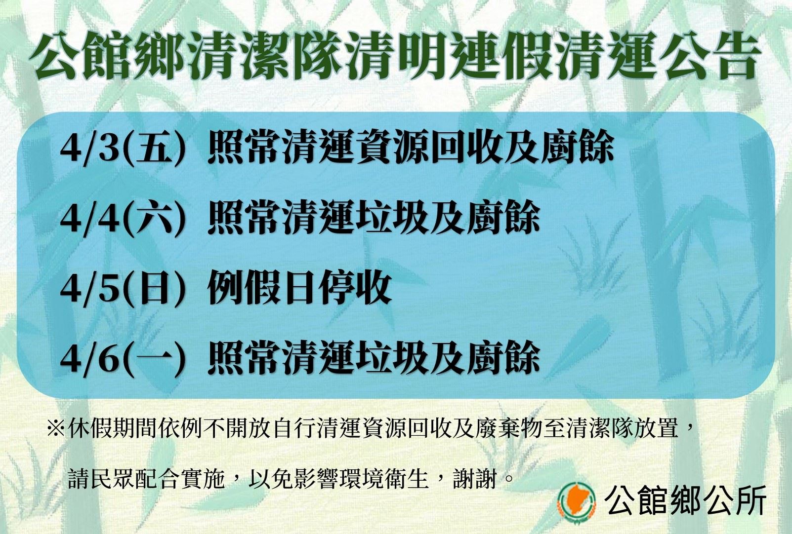 苗栗縣各鄉鎮市清明連假收運辦法不同。根據苗栗縣公館鄉清明連假清運公告,4/3(五)正常清運資源回收和廚餘,4/4(六)、4/6(一)照常清運垃圾和廚餘,4/5(日)例假日停收。