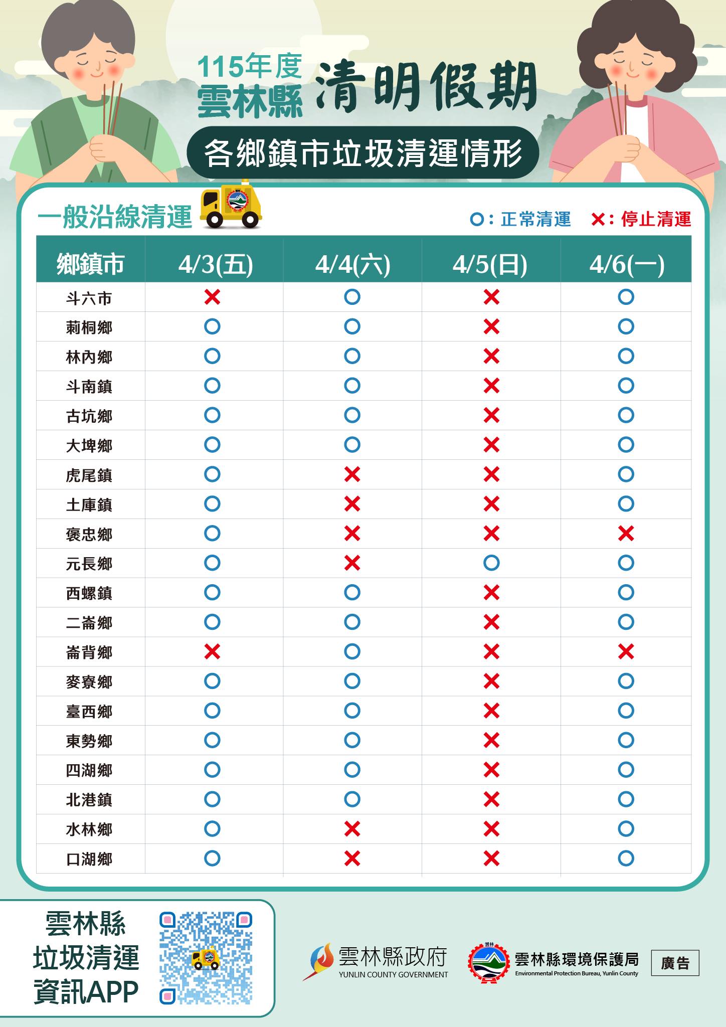 除元長鄉清明節垃圾車正常清運外,其餘鄉鎮市皆無清運;4/6(一)各地區除褒忠鄉、崙背鄉外皆有收垃圾。