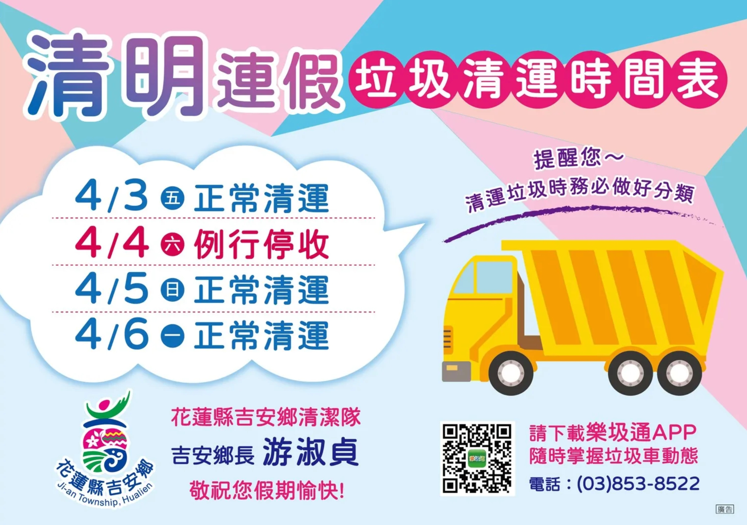 花蓮縣吉安鄉除 4/4(六)例行停收外,4/3(五)、4/5(日)清明節、4/6(一)垃圾正常清運。想知道垃圾車地點,可透過「樂垃通APP」查看。