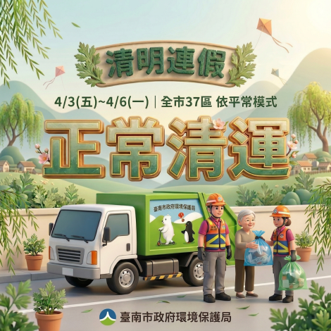 台南市政府表示,清明節連假 2026/4/3(五)~4/6(一) 垃圾車維持正常收運,全市 37 區按原訂時間與地點清運。環保局呼籲,民眾應將一般垃圾、資源回收物和廚餘分開處理,紙類、玻璃、塑膠罐等物品應分類後再交付。