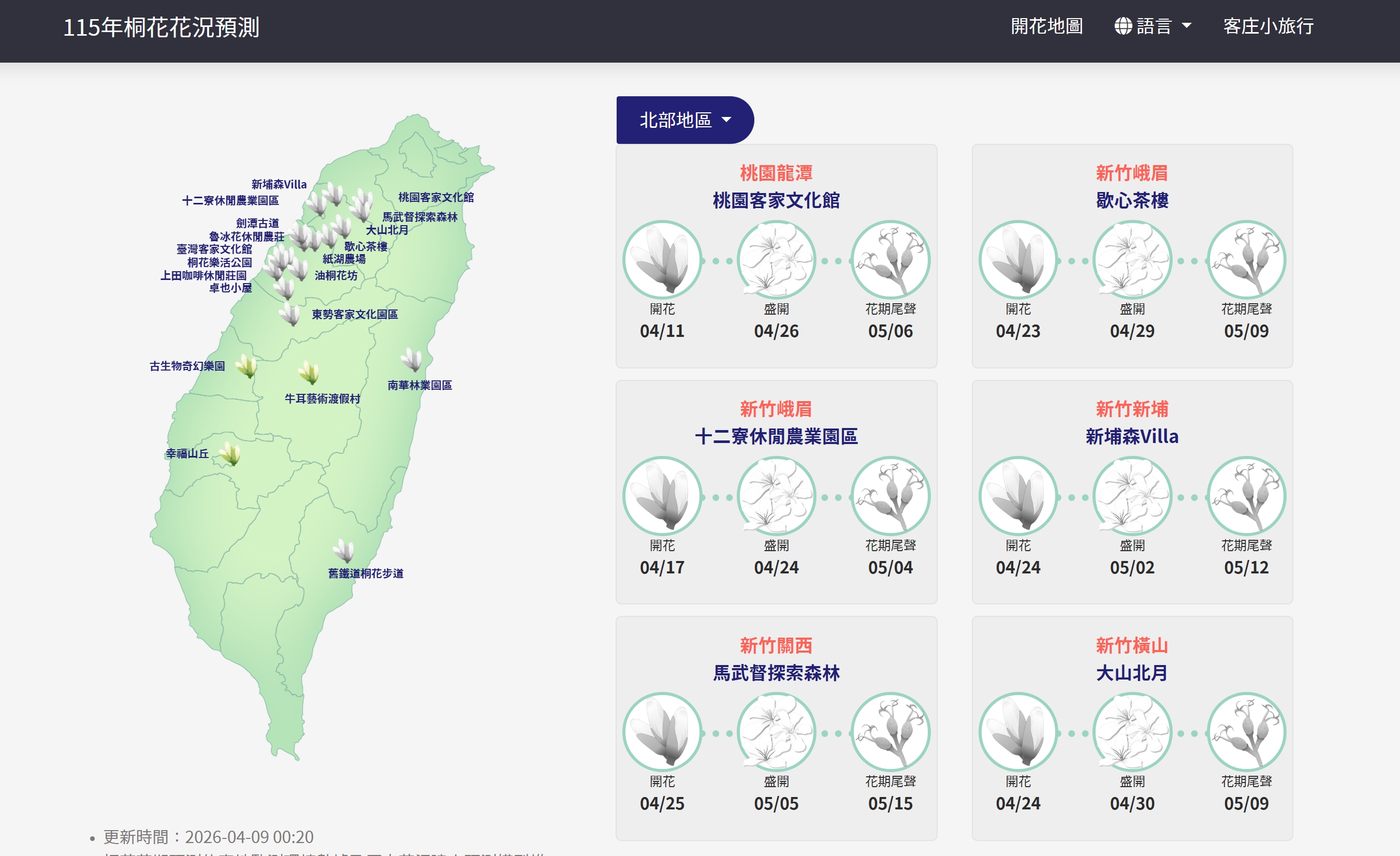 客委會根據歷年花況與實地環境數據,設置了花況預測平台,提供桃園、新竹、苗栗、台中、彰化、南投、嘉義、花蓮、台東近 20 處桐花即時影像及花開預測資訊,可自行上網查詢。