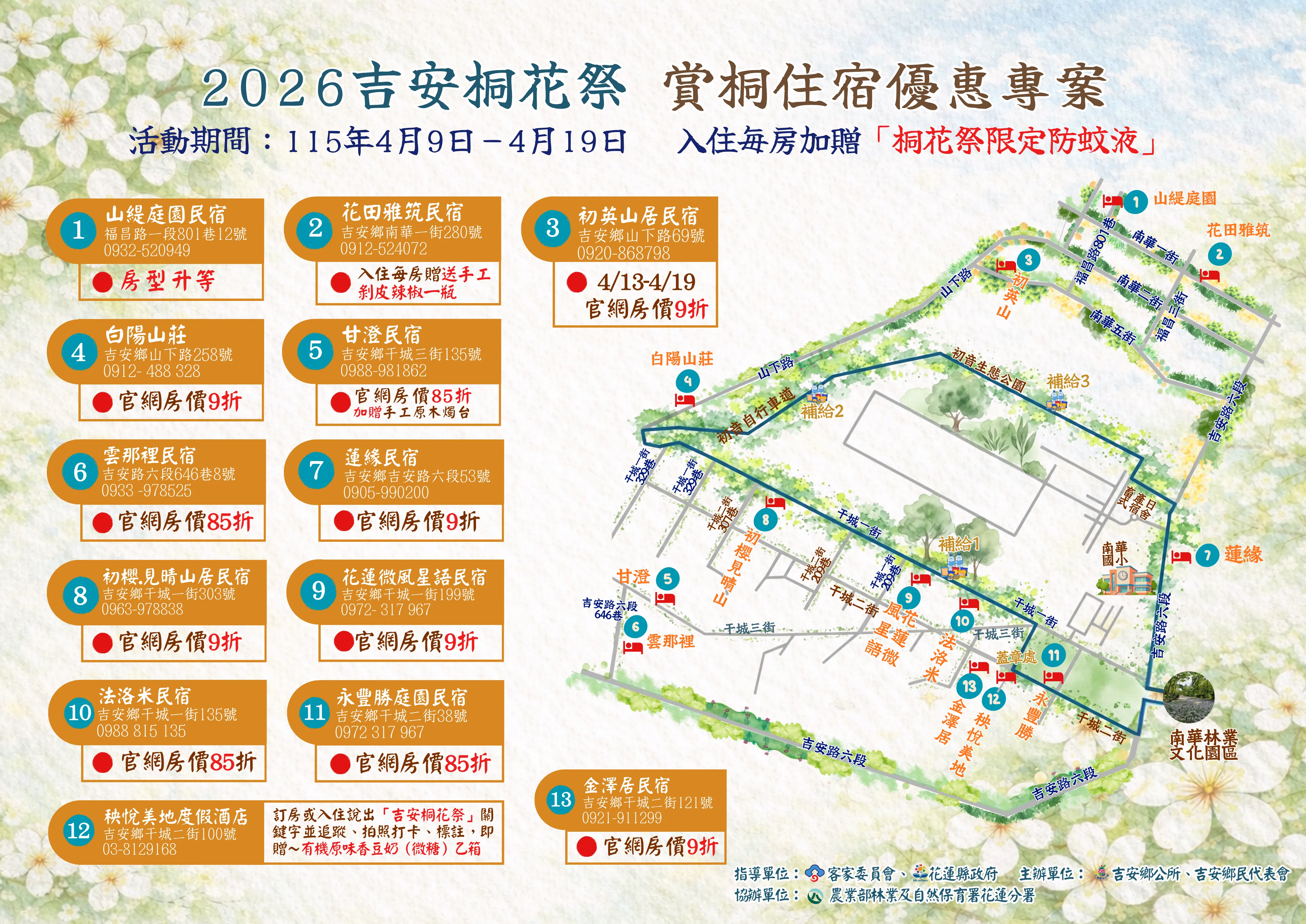 配合花季,園區特別推出優惠活動,入住指定民宿,可享房價 85 折、房型升等或免費送等禮遇;入住時說出「吉安桐花祭」,並完成打卡任務,可獲得「有機原味香豆奶乙箱」!
