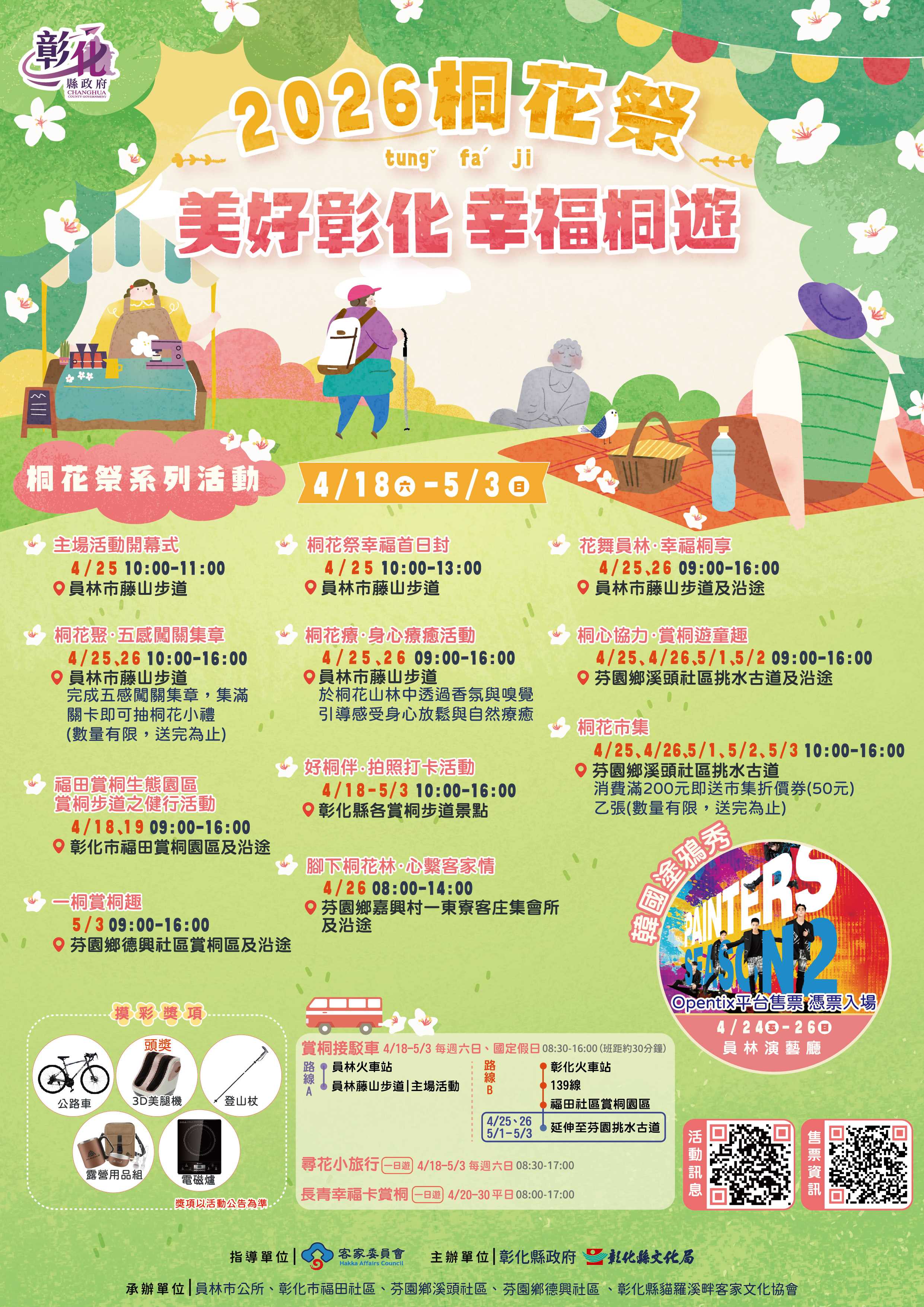 | 2026桐花祭-走進客庄.八卦山桐花健行 | 結合健行、DIY體驗和客家特色表演,並可至客家市集逛逛 | 4/18 南投縣南投市 | 免費 |