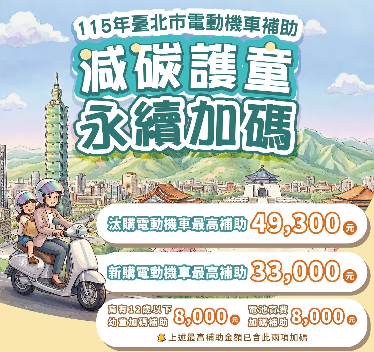 因應 2050 淨零排放目標,台北市政府持續辦理電動機車新購與汰舊換新補助,民眾購買新電動機車或淘汰老舊機車,皆可享有千元至萬元補助,加上中央政府和補助,每輛最多 4 萬 9,300 萬元;中低收入再加碼 1 萬,最多 5 萬 9,300 元。