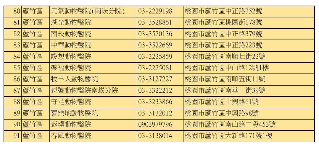 | 元沅動物醫院 | 新豐鄉新庄路295號 | 03-559-6070 |