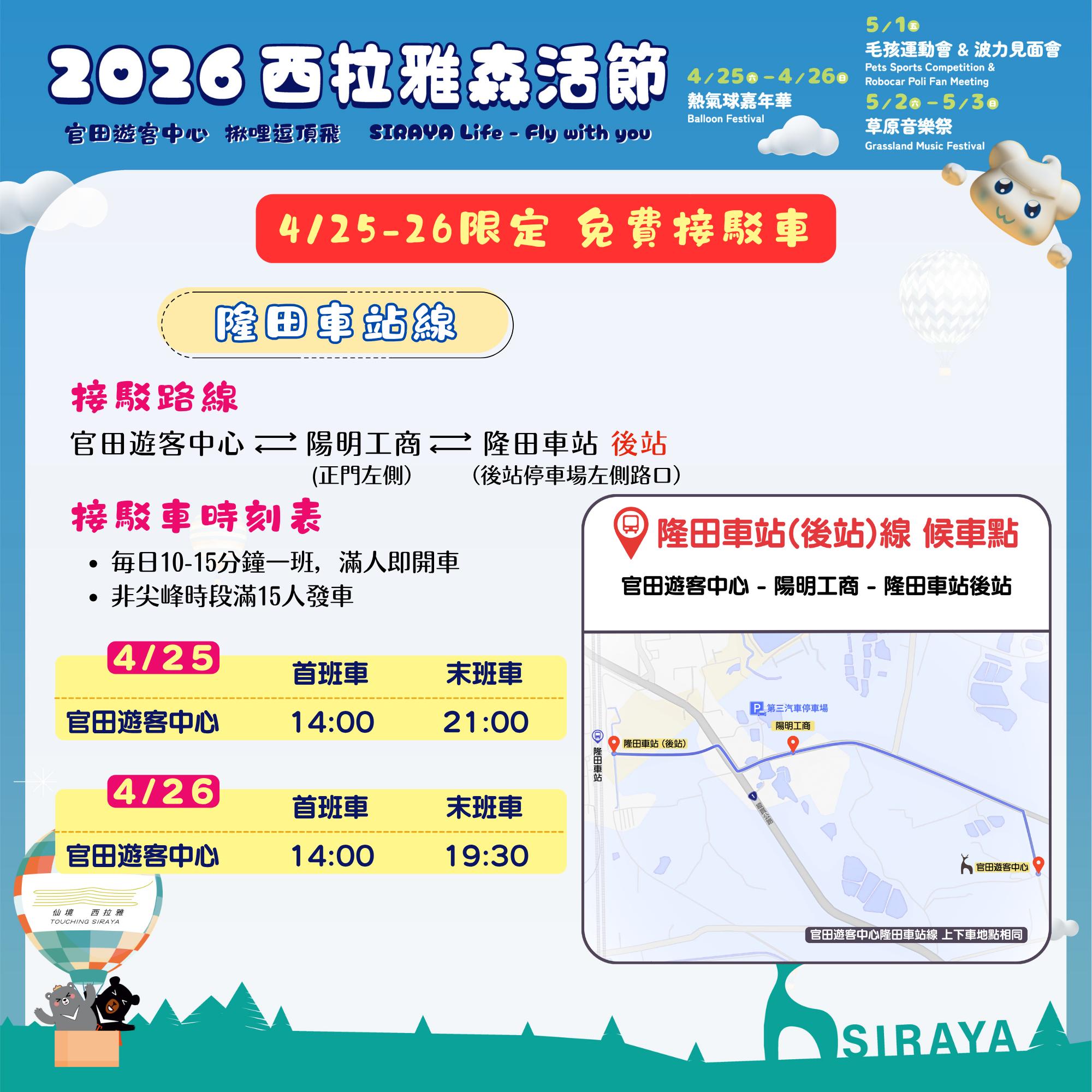 4/25~4/26 有提供免費的接駁車,協助大家從台 1 線、隆田車站抵達活動會場,詳細班次、發車時刻、接駁路線、首末班車資訊可見下圖。
