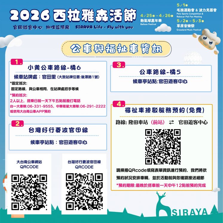 行動不便的朋友,可向台南市政府預約「福祉車」,抵達官田遊客中心。若有需要,可至 Google 表單填寫資料預約。