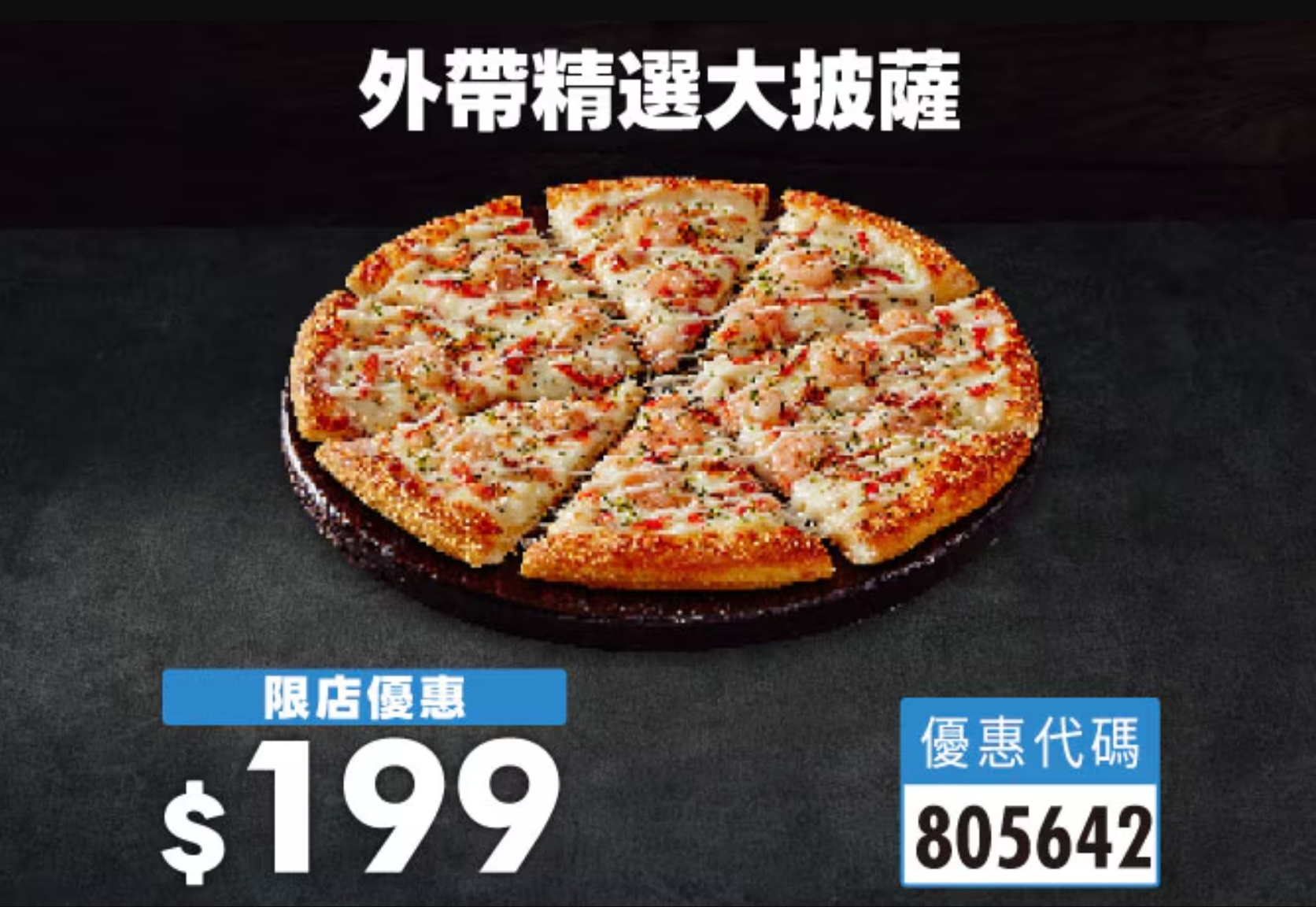 至達美樂官網訂購大披薩,輸入優惠碼【805642】,外帶只要 199 元 ! 有 7 種口味可以選,適用招牌和經典系列披薩。