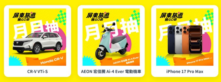 為振興在地經濟並鼓勵民眾到屏東旅遊,屏東縣政府推出「屏東旅遊購GO節」,民眾只要到屏東縣住宿,就可以參加抽獎,有機會把 Honda 百萬油電汽車帶回家 !