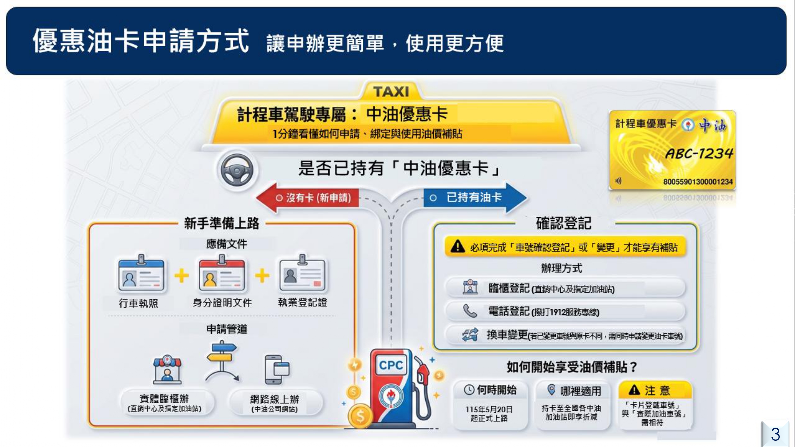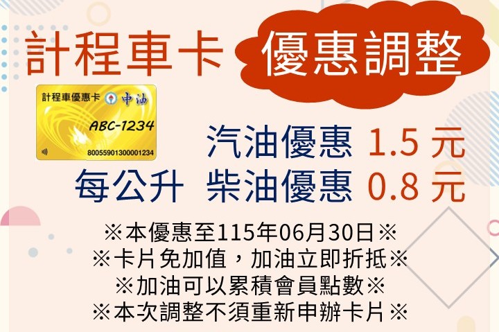 2026 年 5 月 20 日至 8 月 31 日,使用中油計程車優惠卡儲值補助,再至加油站加油,費用將直接折抵。