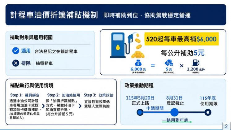 基本上只要是國內的計程車,包括多元計程車,皆可向政府申請補助,每台最多 6000 元 ! 預計補助將在 5/20 開放申請,符合資格的司機,只要將既有的中油優惠卡進行車號登記,或新申辦卡片並完成儲值,再到中油加油站加油,即可取得計程車補助。