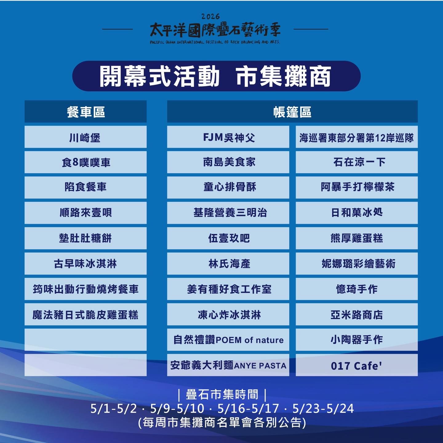 5/1~5/2、5/9~5/10、5/23~5/24 還有市集活動,現場將帶來冰淇淋、排骨酥、義大利麵、咖啡等美食餐飲攤位,攤商名單如下。