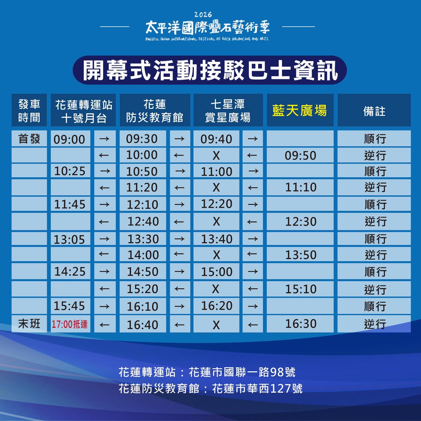 開幕當天也特別規劃了接駁車,協助大家從花蓮市區抵達七星潭,巴士班次如下。
