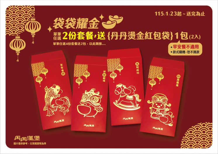 - 1/23 起購買 2 份定食餐,免費送丹丹燙金紅包袋 2 入,買 4 份送 2 包(送完為止)