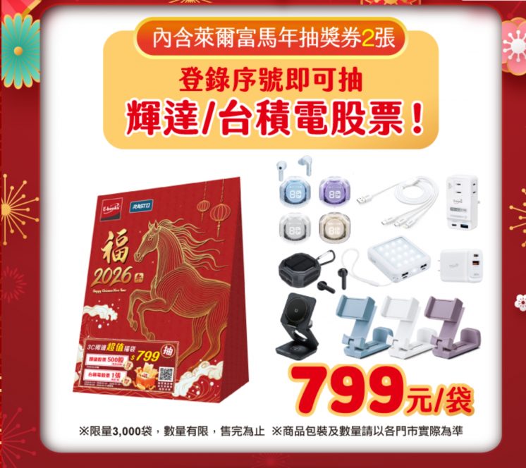 除了馬年福袋、發財卡,萊爾富也同步推出「資訊3C福袋」,迎接 2026 春節 ! 每袋 799 元,內容物有價值 799 元以上的 3C 商品組合和抽獎券 1 張。全台限量 3,000 包,售完為止。